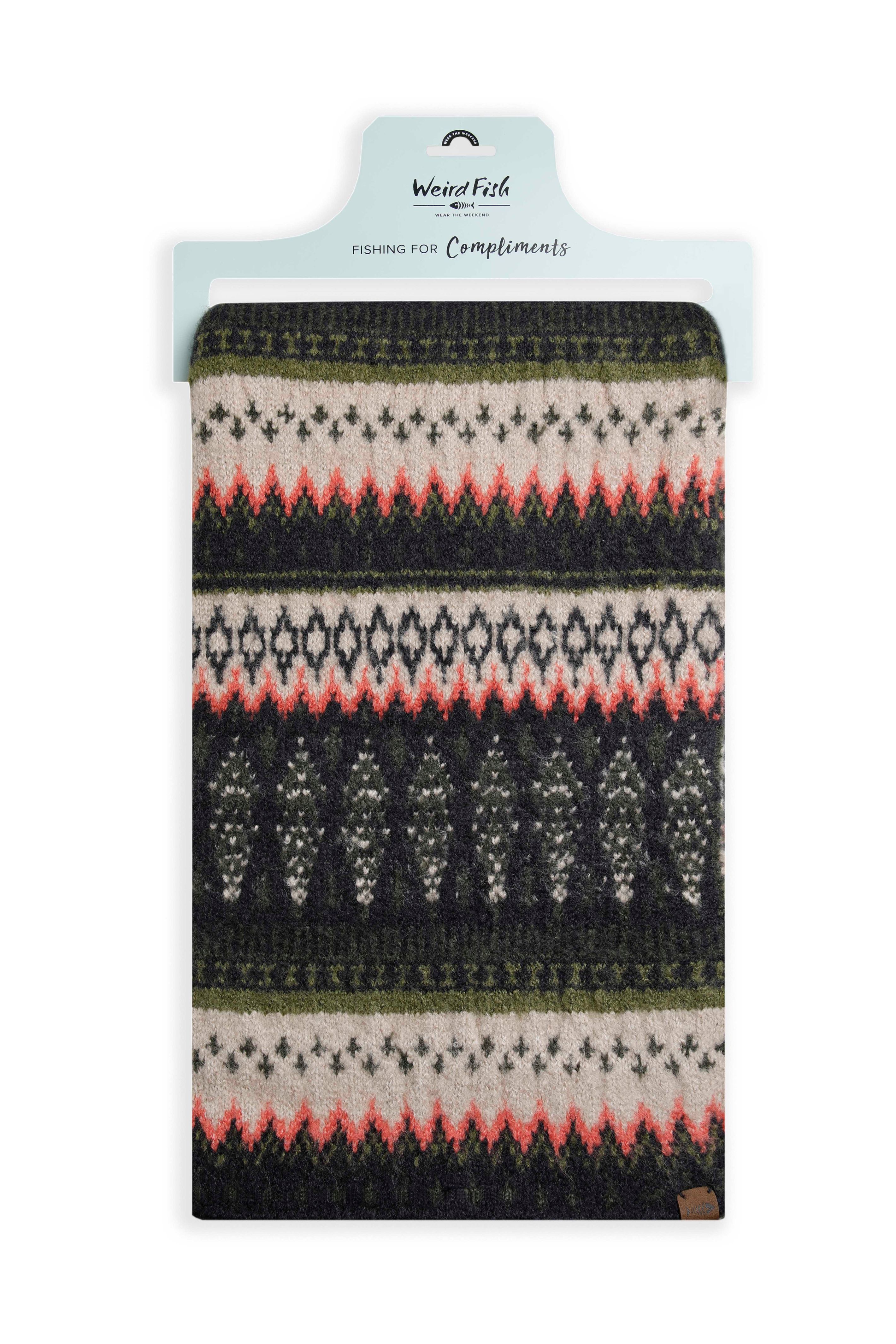 This large scarf could double as a little leg warmer for the sofa or runner on the bed. The Heathfield Fair Isle Scarf has a knitted Fair Isle design, and looks great matched with our Shutt wrist warmers.